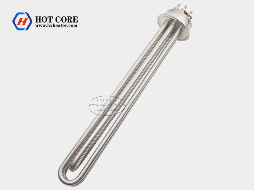 Industrial immersion heaters can be widely used for heating water, 油, 硝酸塩溶液, 酸溶液, アルカリ溶液と低融点金属 (アルミニウム, zinc, tin, babbitt alloy). The curved tubular electric heating element is welded to the flange. Industrial immersion heaters are used for heating in open and closed solution tanks and circulation systems.