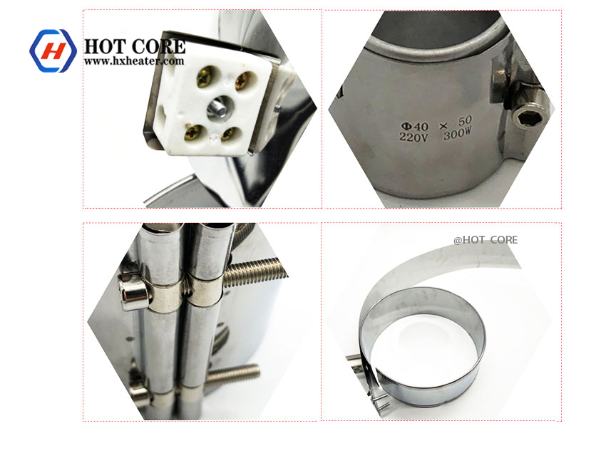 The mica band heater utilizes the good insulation performance and its high temperature resistance. It uses mica board (sheet) as the framework and insulation layer, supplemented by stainless steel plate for support and protection, and can be made into plate, sheet , cylindrical, and cone. Various types of heating devices such as circular shape, cylindrical shape and circle shape. Designable power up to 1000W, can withstand temperature of 600℃.